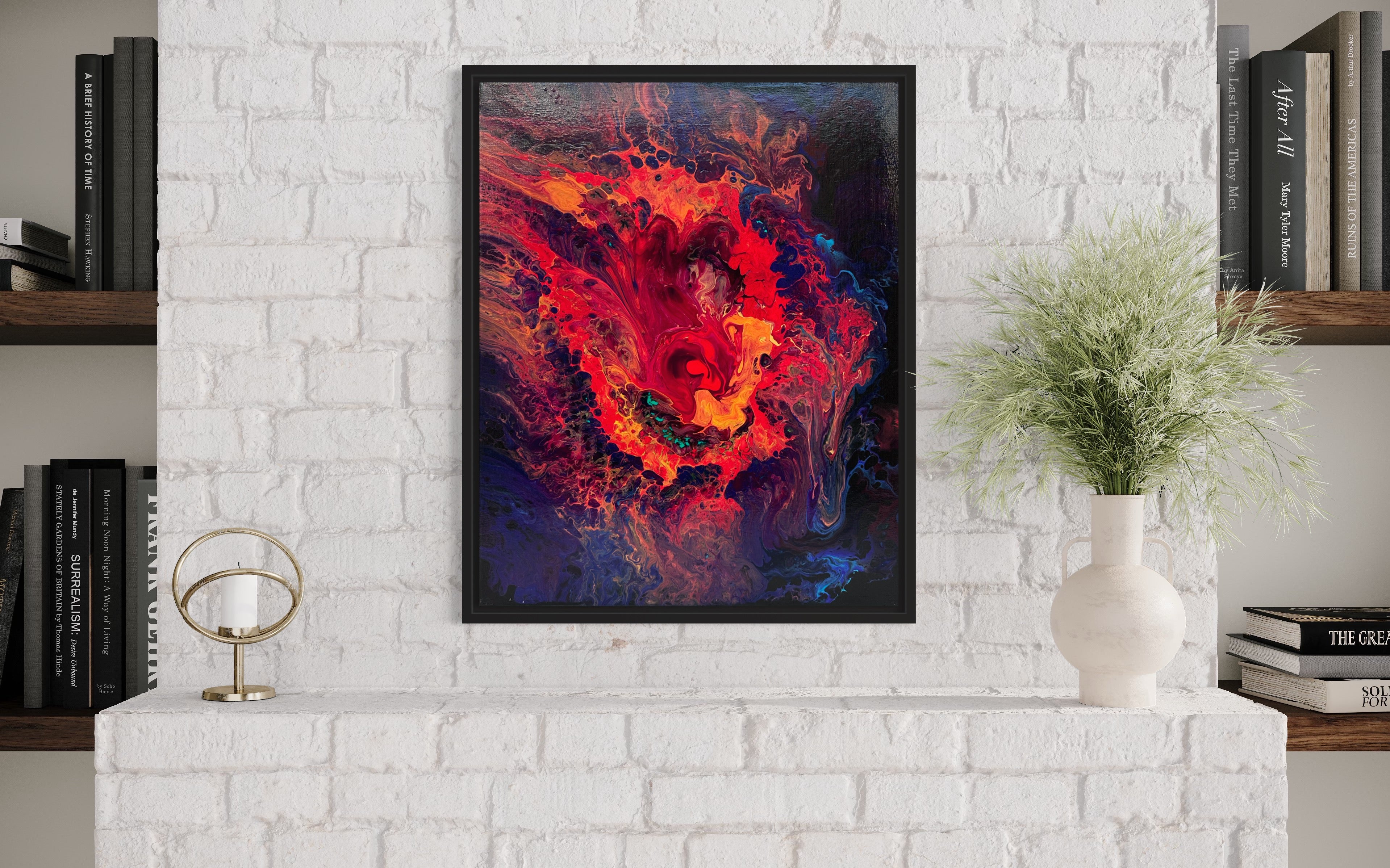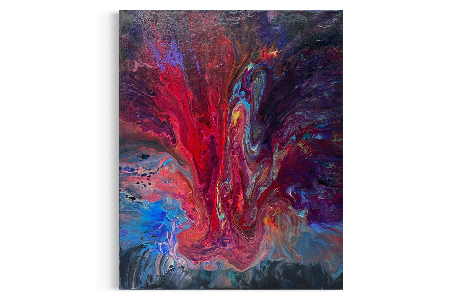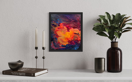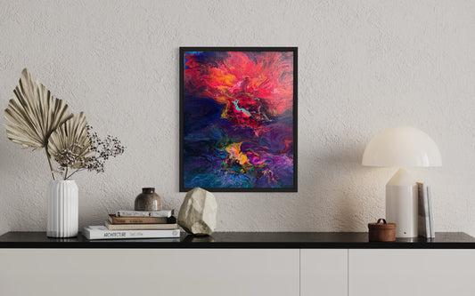 Experience the mesmerising depths of the Earth's heart in this captivating poured acrylic masterpiece. Vibrant pink, purple, and red hues erupt from the canvas, resembling the awe-inspiring spectacle of the planet's core meeting the heavens.