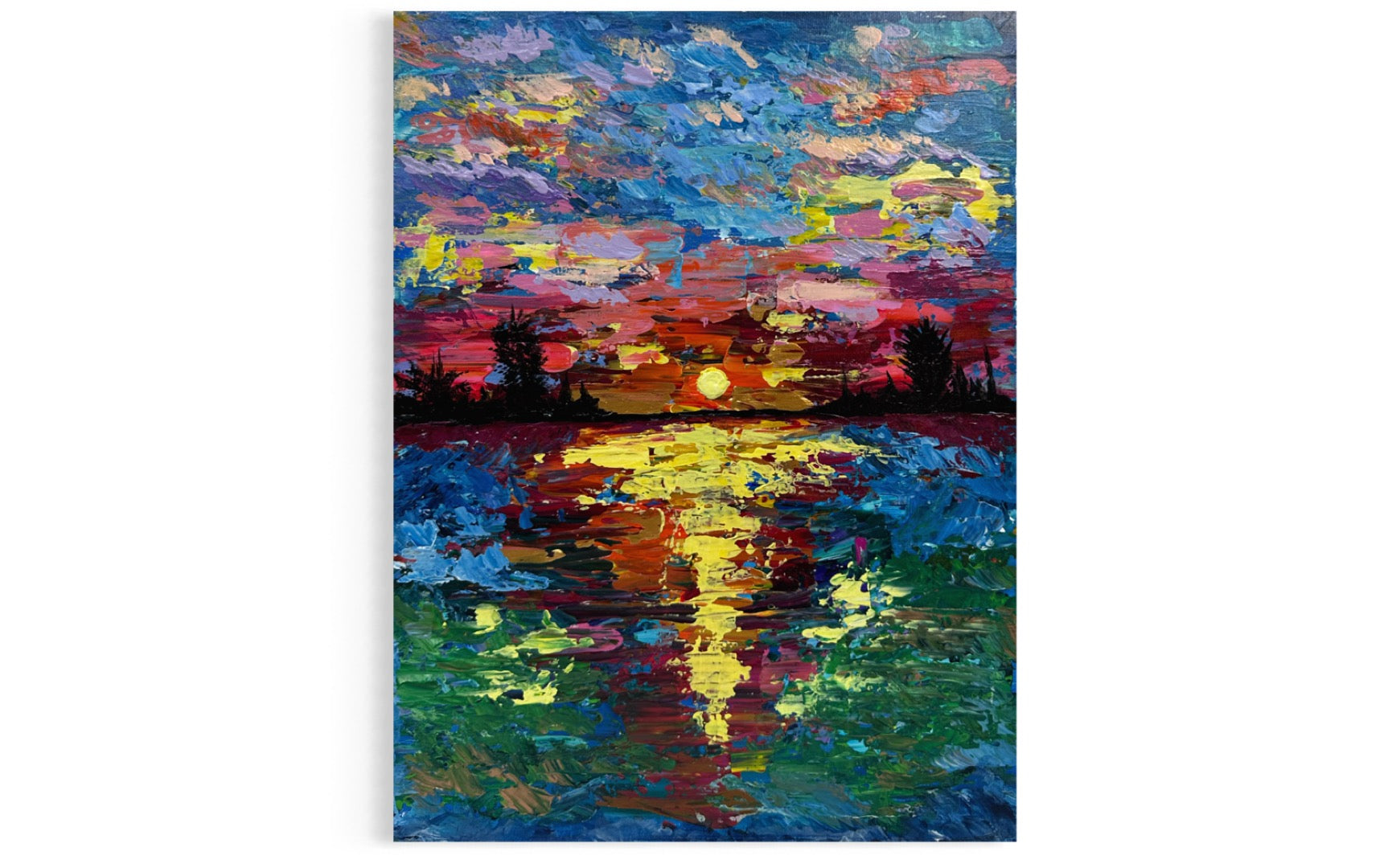 Experience the mesmerising beauty of nature in this acrylic masterpiece. Capturing the enchanting moments of a sunset at dusk, where the sky ignites in a symphony of magenta, cotton candy pink, and orange hues. The golden sun casts its fiery reflection upon a tranquil lake, creating a captivating and dreamlike scene that evokes a sense of wonder and serenity.