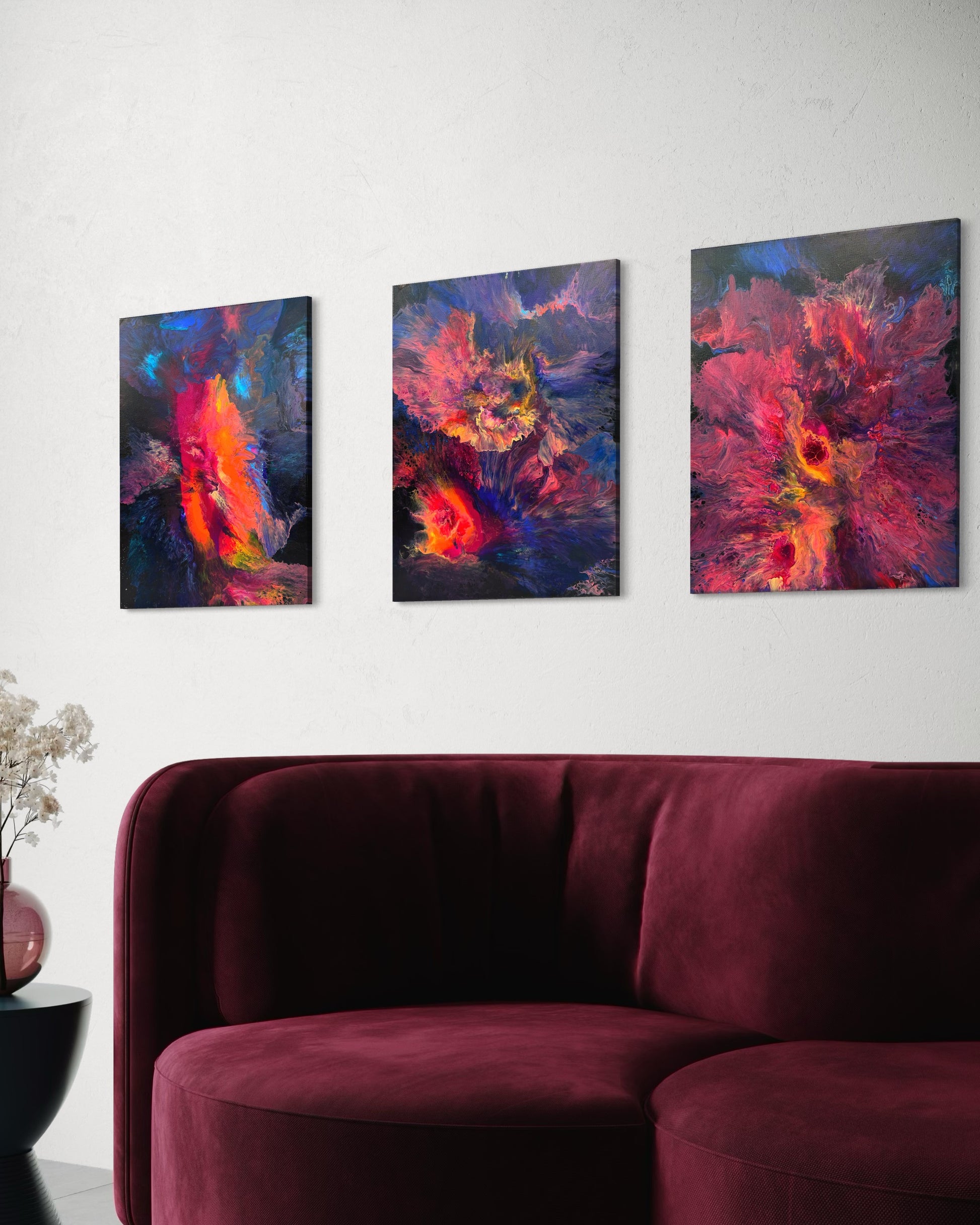 Witness the universe in motion with "Ethereal Triad," a stunning three-panel creation that captures the eternal dance of chaos and beauty. Swirls of fiery reds, luminous golds, and electric blues erupt across a dark cosmic expanse, evoking the birth of stars and the mysterious forces of creation. Each panel radiates a unique energy, yet together they form a symphony of light and shadow, guiding the viewer through realms of transformation and illumination. This harmonious set celebrates the cycle of destruction, renewal, and the infinite wonder of the cosmos, inviting you to lose yourself in its boundless depths.