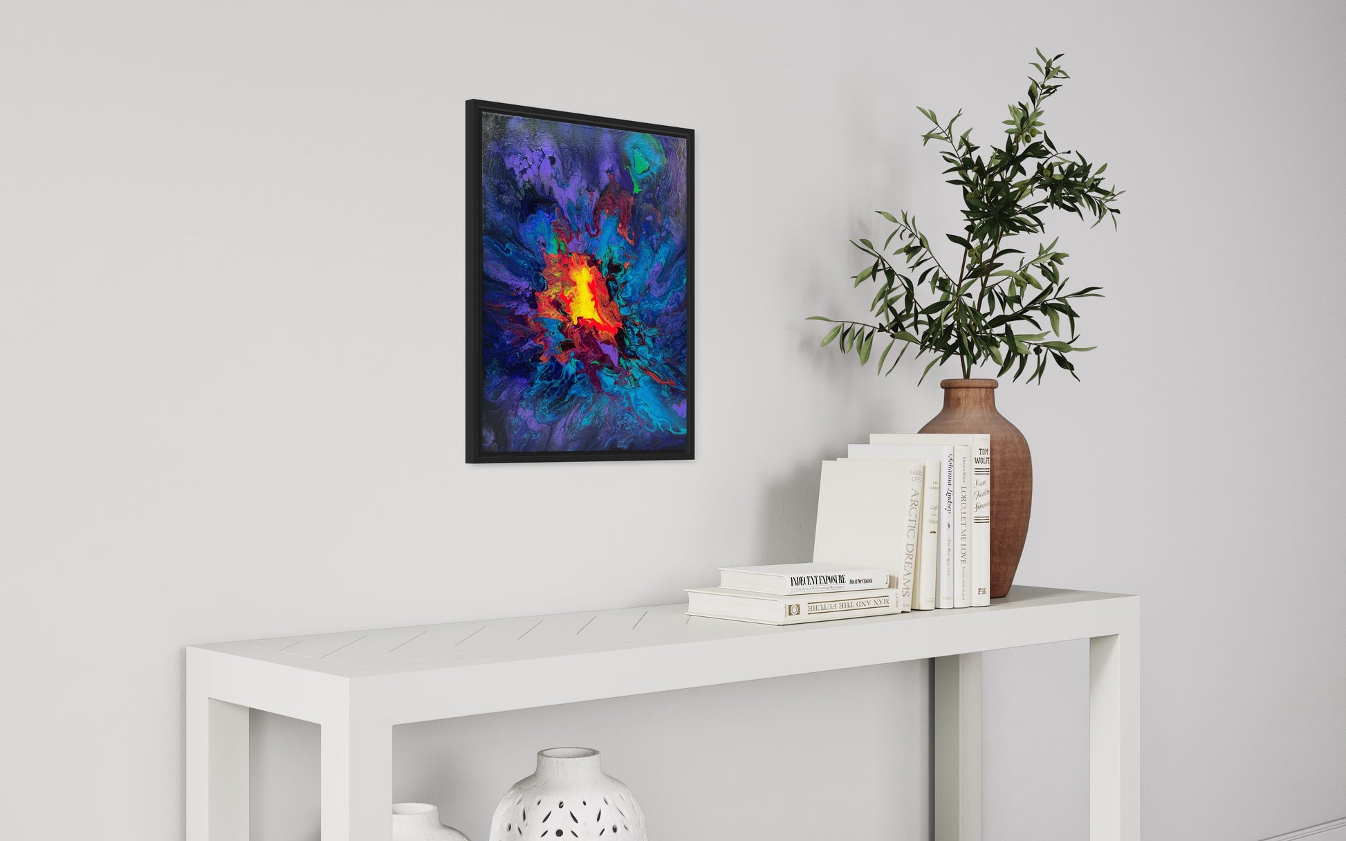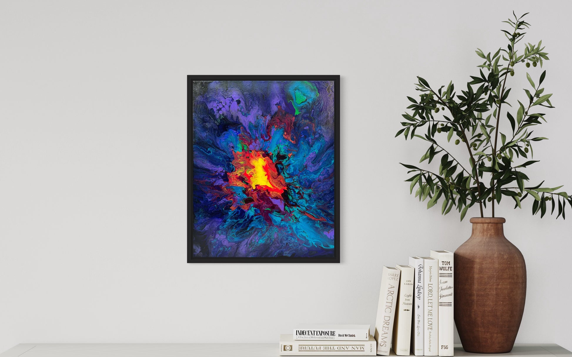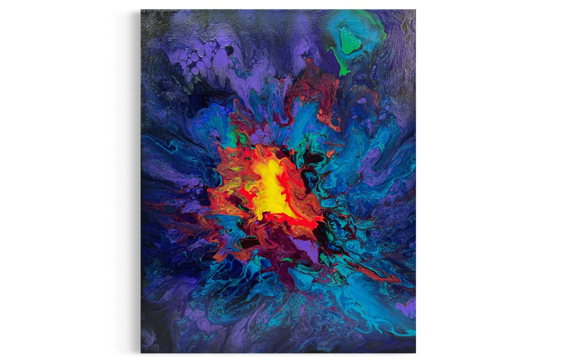 Capturing the Essence of Creation: This vibrant poured acrylic masterpiece evokes the awe-inspiring birth of the universe. Radiant streams of yellow and red burst forth from the core, gracefully transitioning into the rich, cosmic hues of deep purple, teal, and blue-green. A symphony of colours dance across the canvas, inviting viewers to witness the dynamic energy and majesty of the Big Bang's transformative journey.