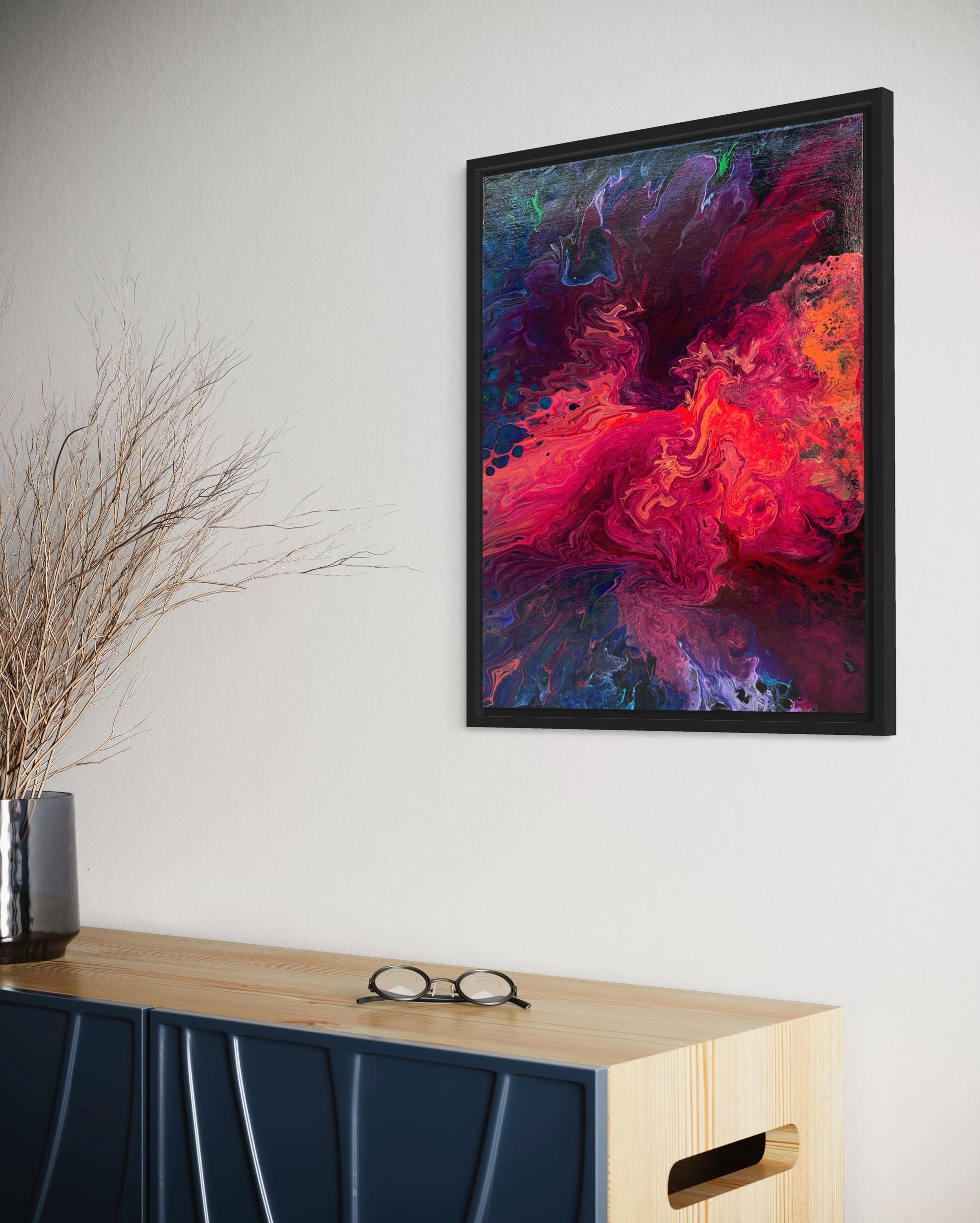 Capturing the cosmic dance of creation, this poured acrylic masterpiece portrays a mesmerising nebula eruption amidst the serene expanse of space. Swirling hues of pink, purple, and orange cascade across the canvas, evoking the dynamic beauty and awe-inspiring energy of a celestial phenomenon frozen in time.