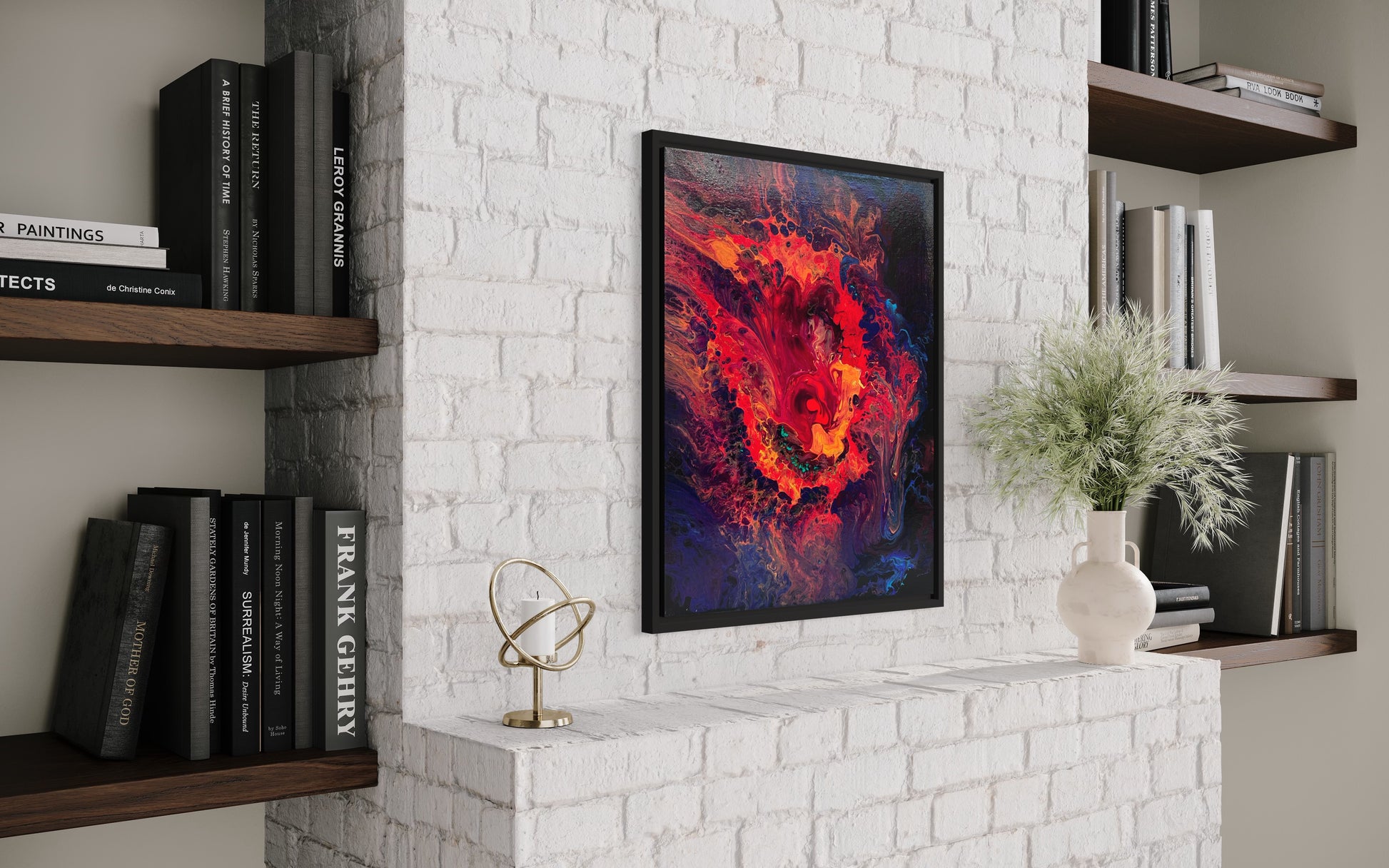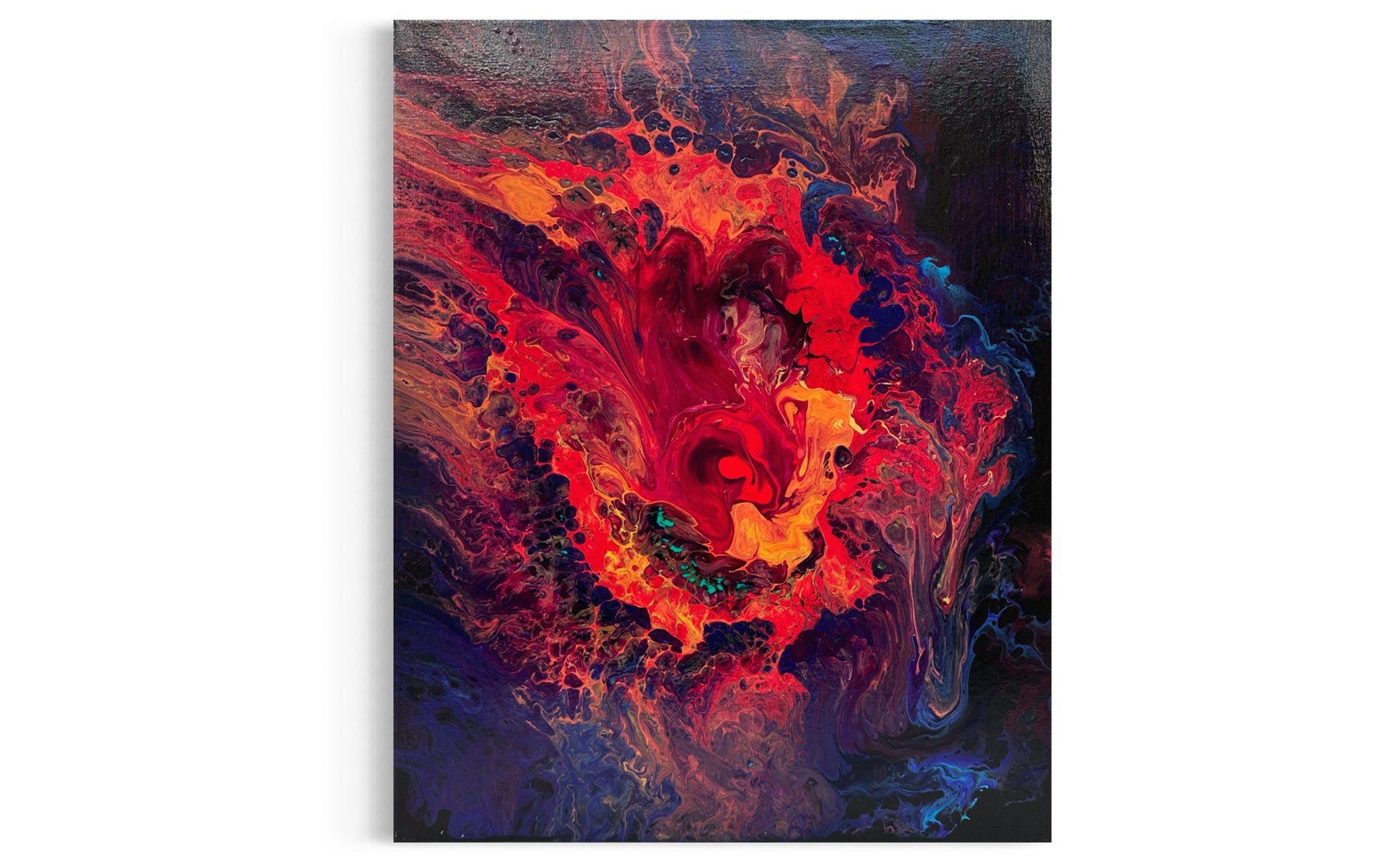 Immerse yourself in the captivating cosmos with this dynamic poured acrylic masterpiece. A fiery meteor streaks through the infinite void of space, its blazing hues of orange, red, yellow, and blue igniting the canvas with intense energy. Against the velvety black backdrop, the vibrant contrast conjures the essence of interstellar wonder, inviting you to witness the celestial dance between light and darkness.