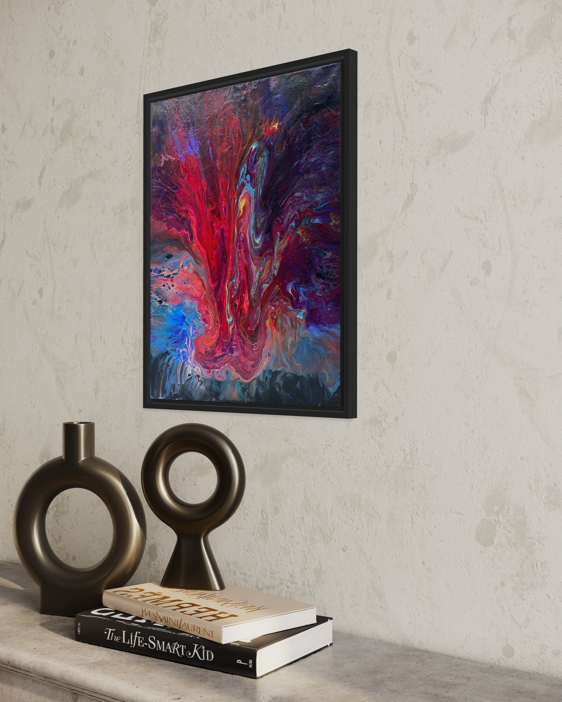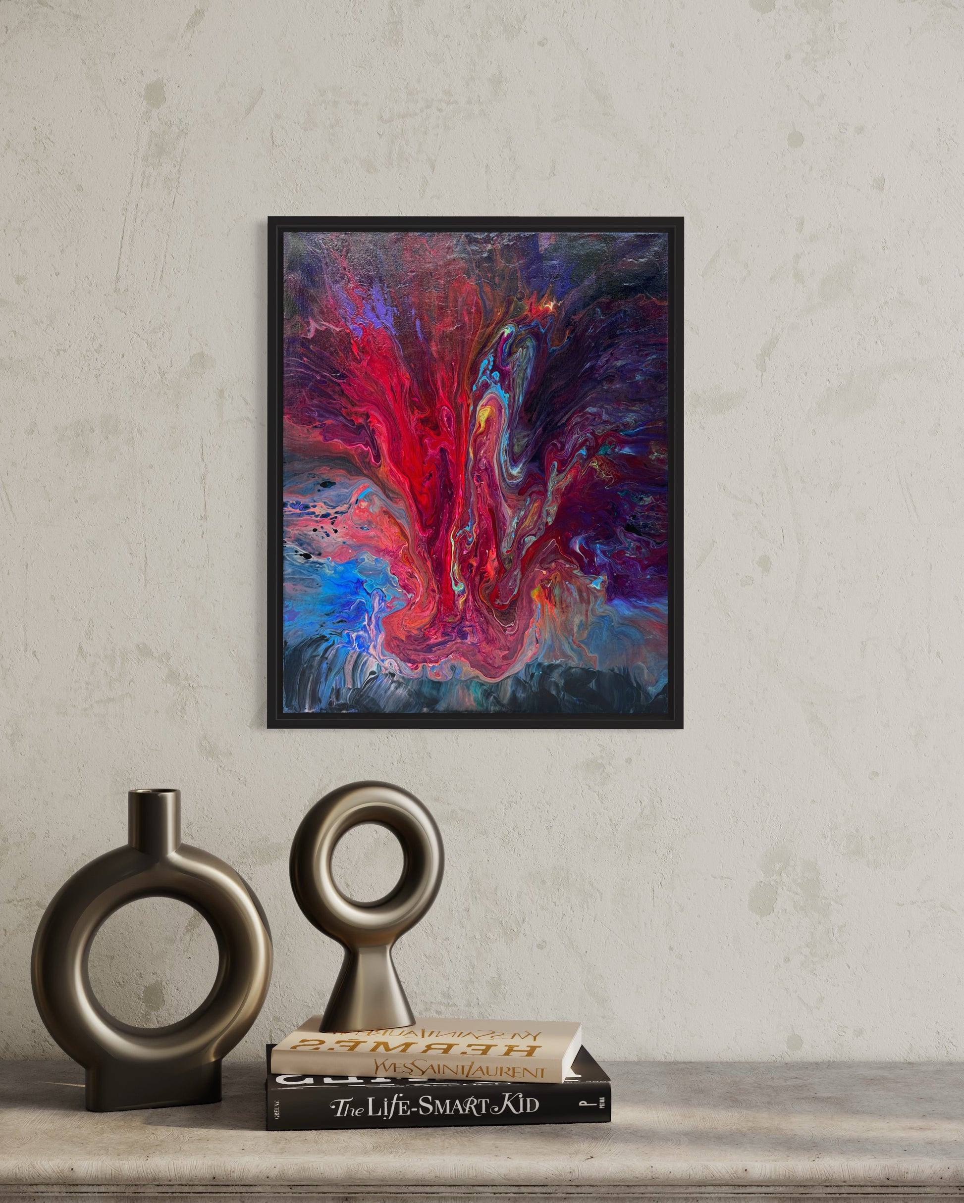 Experience the mesmerising depths of the Earth's heart in this captivating poured acrylic masterpiece. A symphony of vibrant pink, purple, and red hues erupt from the canvas, mimicking the awe-inspiring spectacle of the planet's core meeting the heavens. The swirling, abstract composition invites you to immerse yourself in a breathtaking display of colour and energy, evoking a sense of wonder and the timeless connection between Earth and sky.