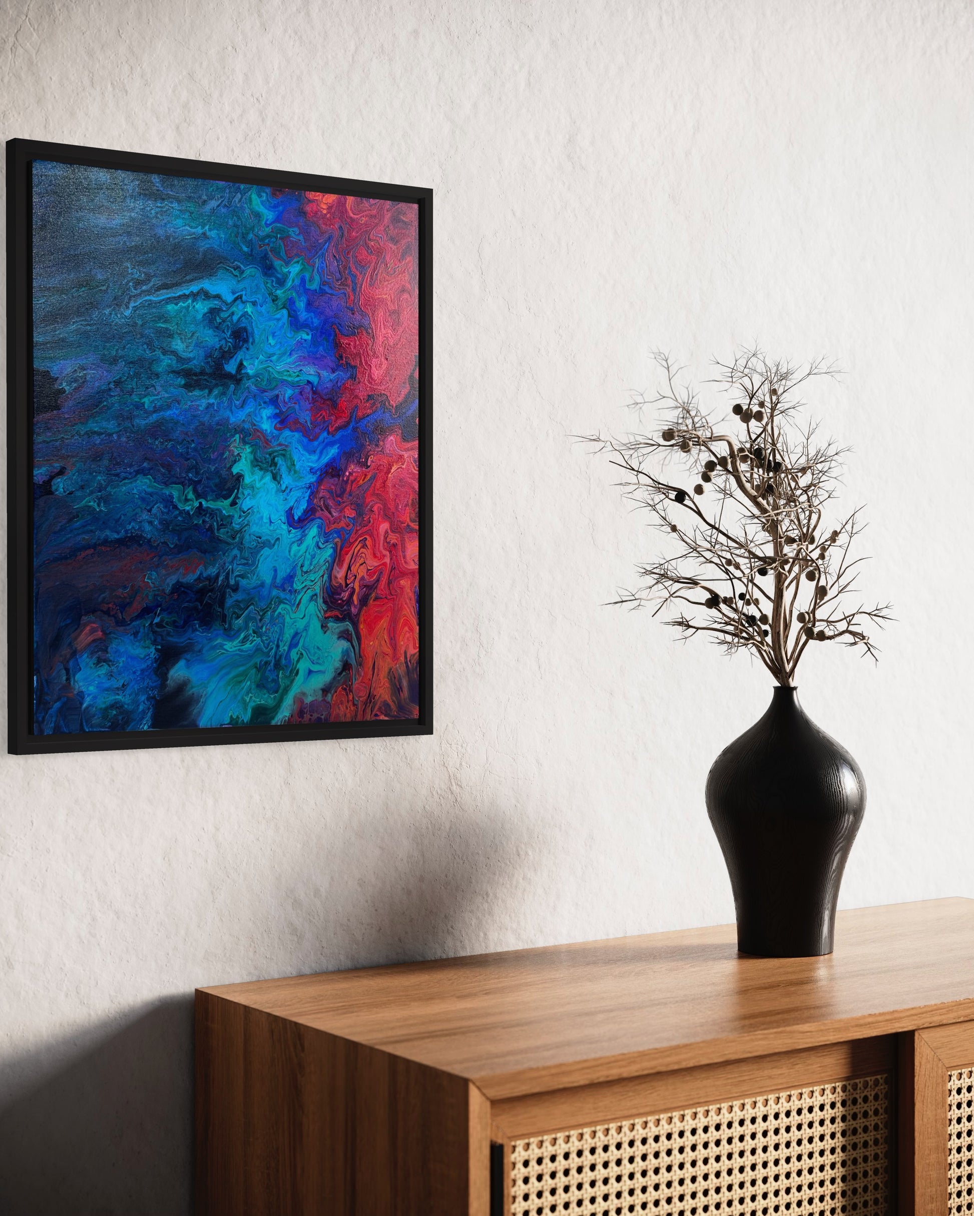 Immerse yourself in the captivating dance of the elements as vibrant waves of rich blue and fiery red interlace, evoking a mesmerising portrayal of fire succumbing to the tranquil embrace of water in this dynamic poured acrylic masterpiece.